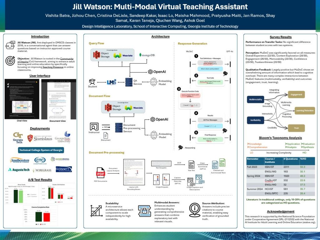 Jill Watson is an AI virtual teaching assistant developed by Georgia Tech’s Design Intelligence Lab. It engages students in meaningful conversations on course materials such as textbooks, leveraging Retrieval Augmented Generation (RAG) and OpenAI’s ChatGPT for enhanced accuracy, reduced hallucinations, and increased resistance to toxic inputs. Rooted in the Community of Inquiry framework, Jill aims to (virtually) boost Teaching Presence, which in turn enhances Social and Cognitive Presence in educational settings. Jill can be deployed in multiple institutes as an LTI tool for one-on-one conversations in a classroom LMS (like Canvas or Blackboard) or on a discussion forum (such as EdStem). Research has demonstrated Jill’s ability to improve Teaching Presence, student grades, and student retention rates. Current efforts focus on scaling Jill for broader use, expanding multimodality, and adding features that further support student learning.